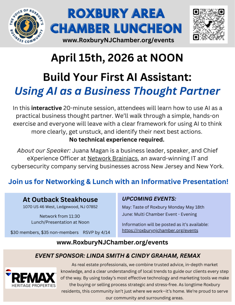 Information for our events will be available on our website https://roxburynjchamber.org and will be updated as more information is available. We have a nice mix of luncheons, evening and morning events to include everyone that can’t make our luncheons. We hope to see you soon!