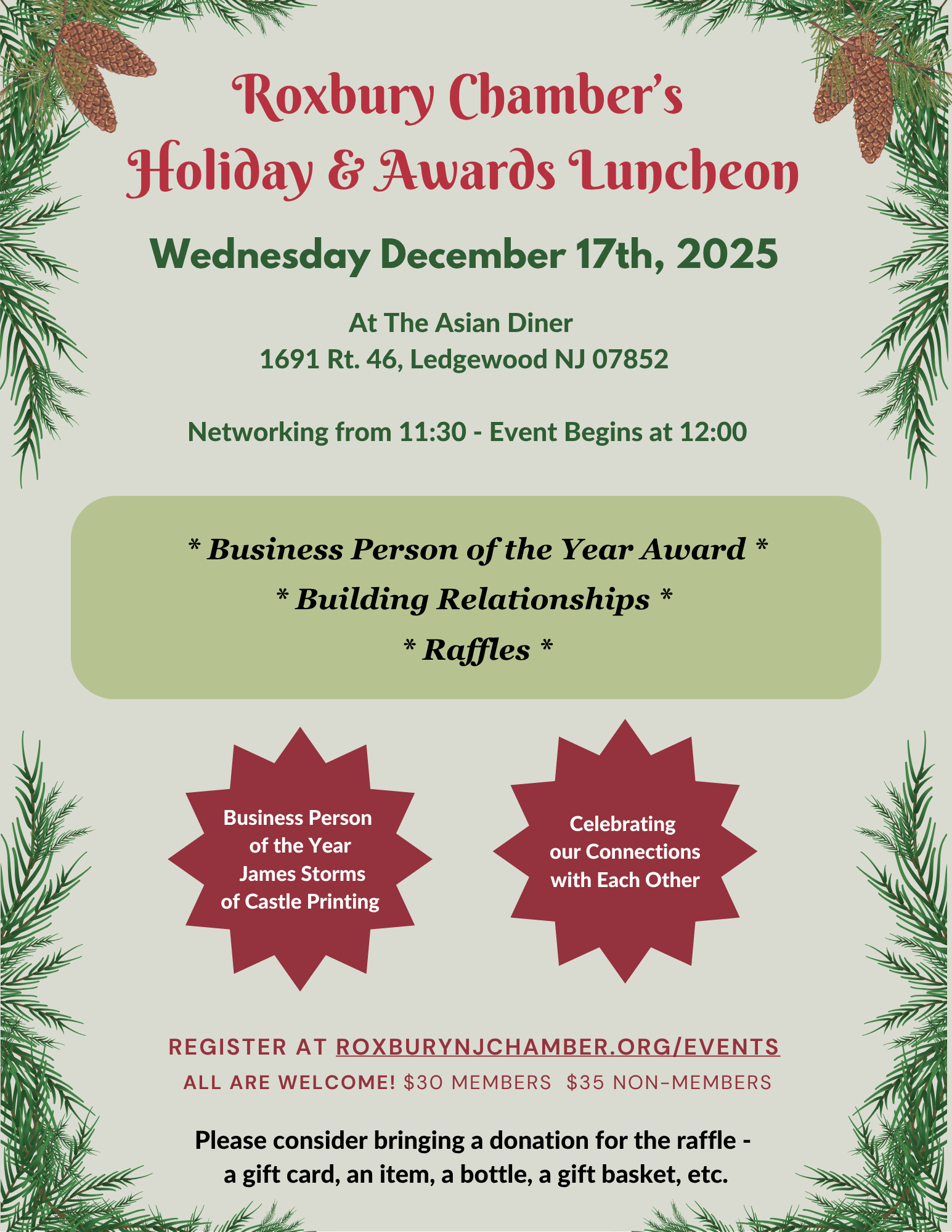 Roxbury Chamber's Holiday and Awards Luncheon. Come celebrate with us! Networking and fun while we get to know each other better.